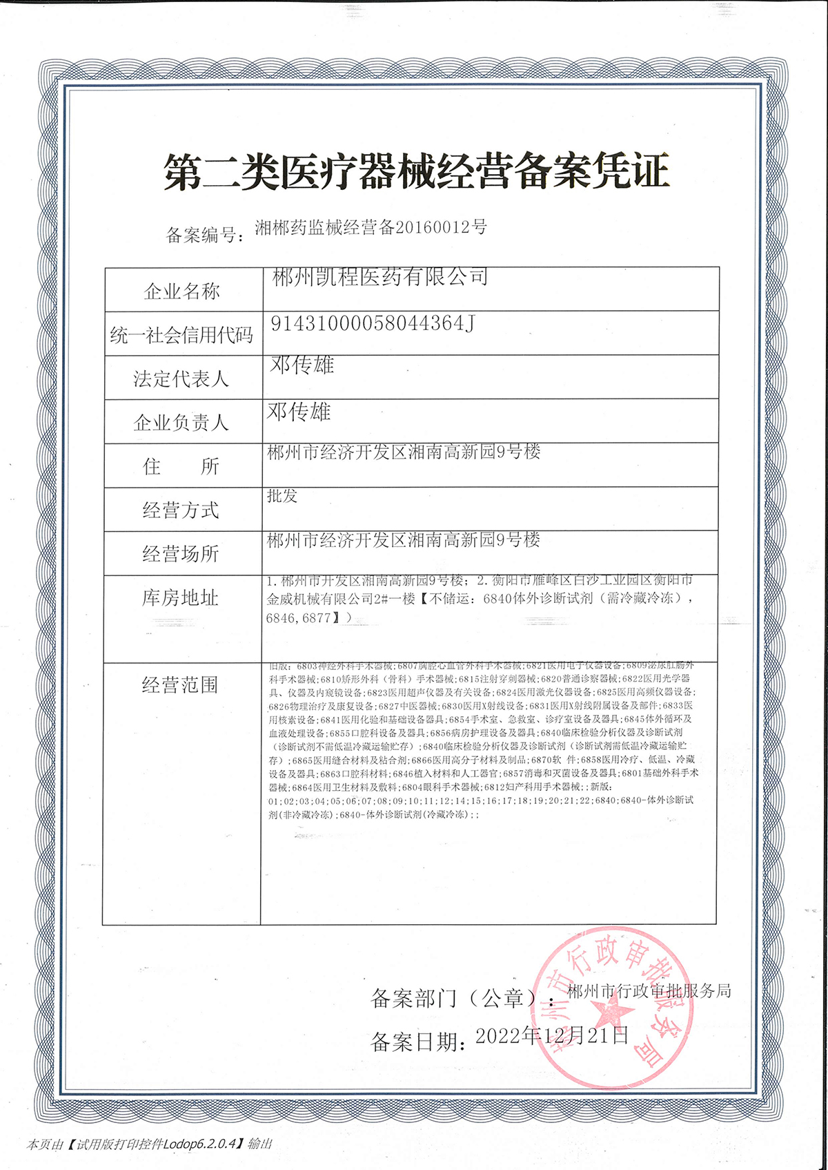 第二類醫療器械經營備案憑證:湘郴藥監械經營備20160012號